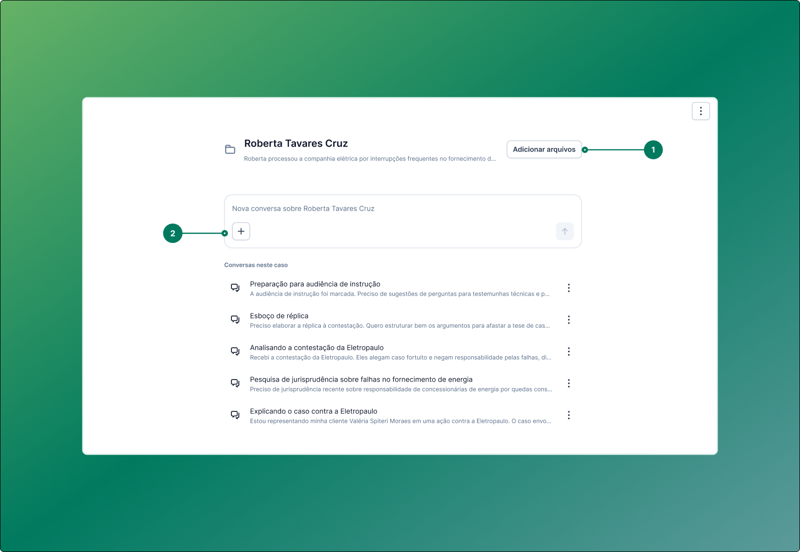 Adicionar arquivos à memória de todo o Caso: existe um botão de "adicionar arquivos" no ambiente geral do Caso. Os documentos enviados por ali (como PDFs e imagens) passam a compor a memória persistente e compartilhada, servindo de contexto para todas as conversas futuras criadas naquele ambiente. Isso é ideal para quando há um andamento novo no processo e você precisa atualizar o histórico para o assistente.