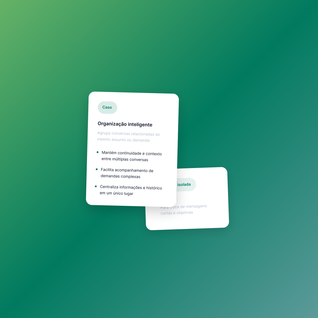 A funcionalidade Casos reúne o contexto compartilhado ao longo das interações para criar uma memória persistente, compartilhada entre todas as conversas.