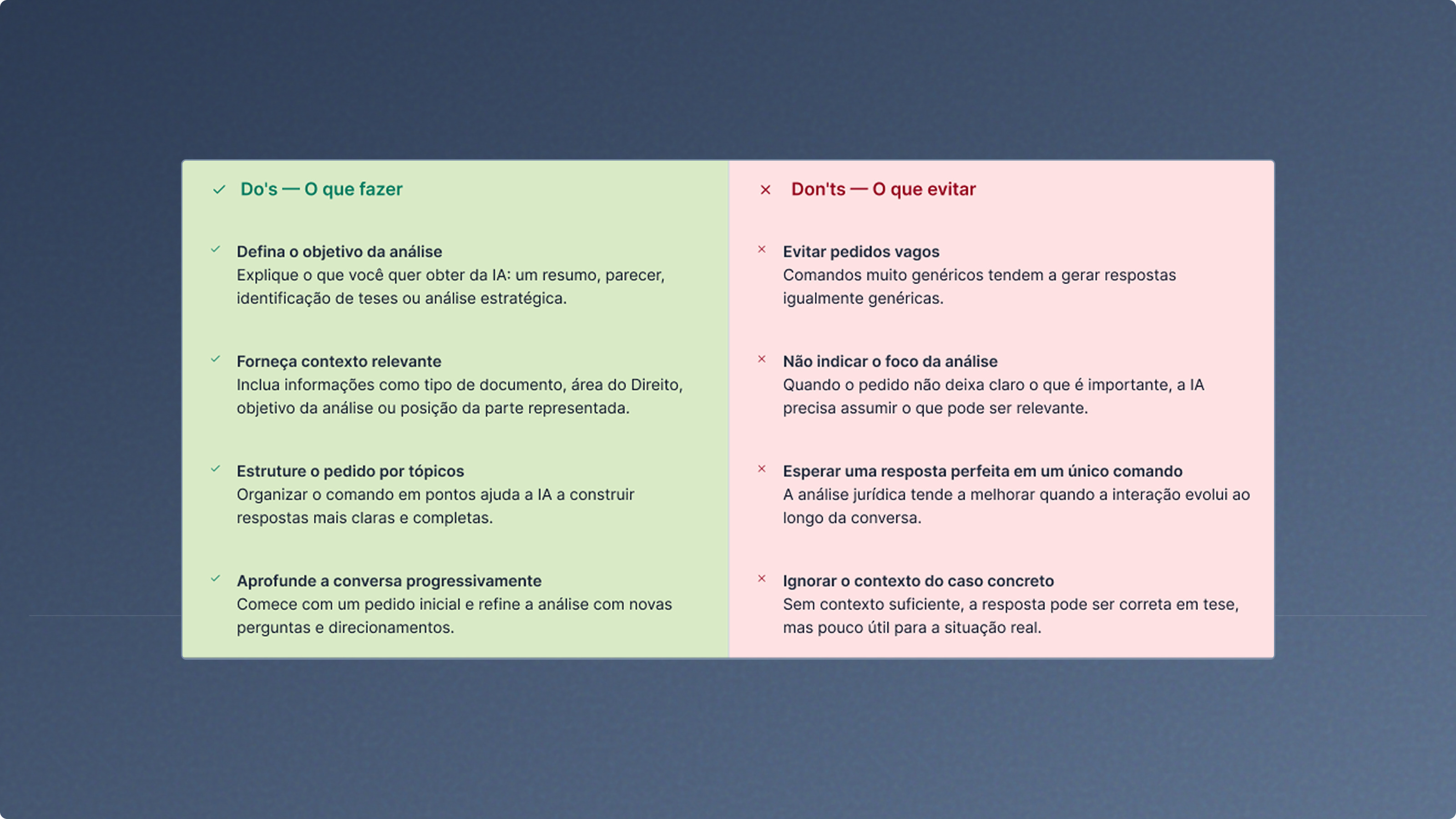 Para vencer a barreira da página em branco e garantir que o Jus IA entregue análises de alto nível, aplique estas boas práticas ao estruturar seus comandos: