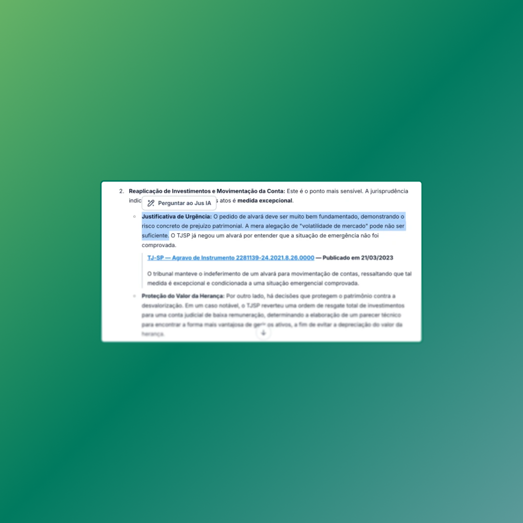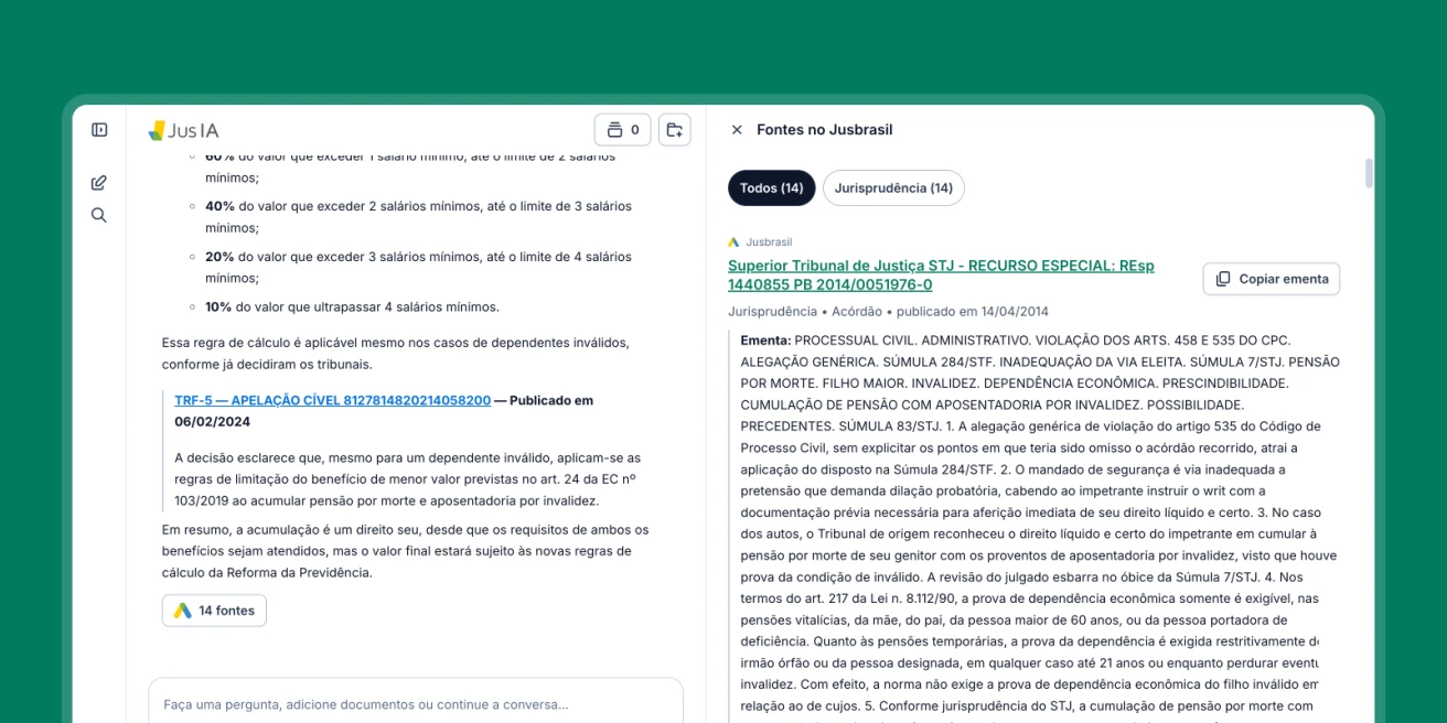 A Pesquisa Fundamentada permite que o Jus IA construa respostas diretamente a partir da base do Jusbrasil, com maior densidade e rigor jurídico.
