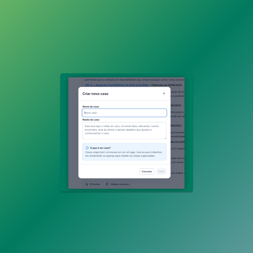 A funcionalidade Casos permite reunir conversas, documentos e estratégias relacionadas a um cliente ou processo em um único espaço.